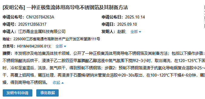 2025年10月14日,江蘇甬金金屬科技有限公司成功申請(qǐng)一項(xiàng)名為“一種正極集流體用高導(dǎo)電不銹鋼箔及其制備方法”專利,申請(qǐng)公布號(hào)為CN120784263A,申請(qǐng)日期為2025年9月10日。