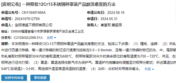 2024年8月16日,寶鋼德盛不銹鋼有限公司成功申請一項名為“一種降低12Cr13不銹鋼種罩退產品酸洗難度的方法”專利,申請公布號為CN118497466A,申請日期為2024年5月31日。